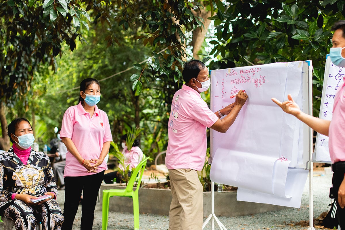 Participants in a Community Engagement Research Project in Vientiane Capital, Lao PDR, jointly draw a map of the village to understand the life of the villagers beyond health, identifying vulnerable populations in the village.